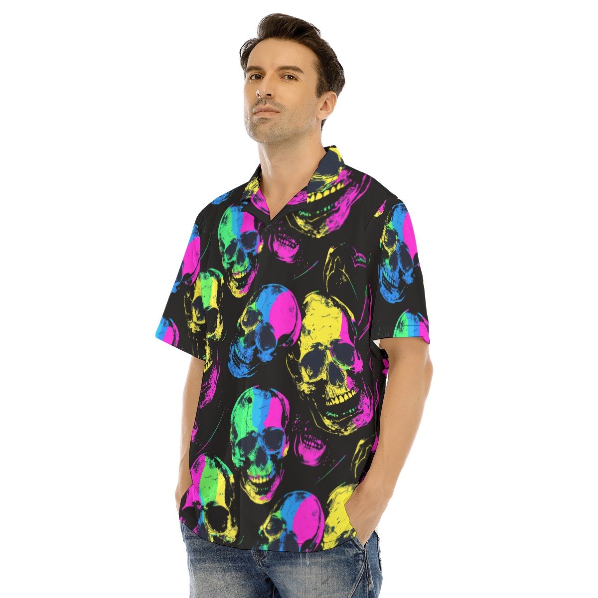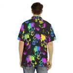 Turn heads with bold, electric energy. The Neon Skulls button-up takes classic macabre vibes and blasts them into overdrive with a vibrant neon palette. Layers of skulls in hot pink, lime green, cyan, and highlighter yellow pop against a deep black background, giving you a shirt that feels part rock concert, part night club, all attitude.